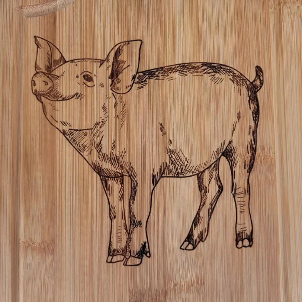 Gør madlavningen lidt mere hyggelig med dette charmerende bambus skærebræt med sød grise motiv. Den fine illustration giver brættet et unikt og personligt udtryk.