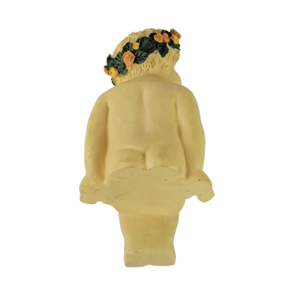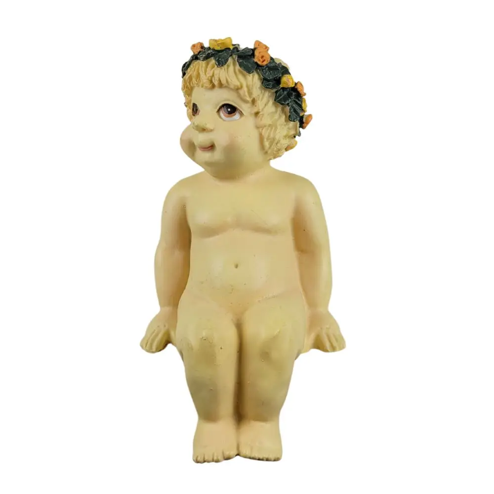 Denne charmerende barn med blomsterkrans forestiller et siddende barn prydet med en smuk blomsterkrans i varme, jordnære farver. Med fine detaljer og en naturlig kropsform udstråler figuren en nostalgisk elegance, der kan tilføre en vintage stemning til ethvert hjem.
