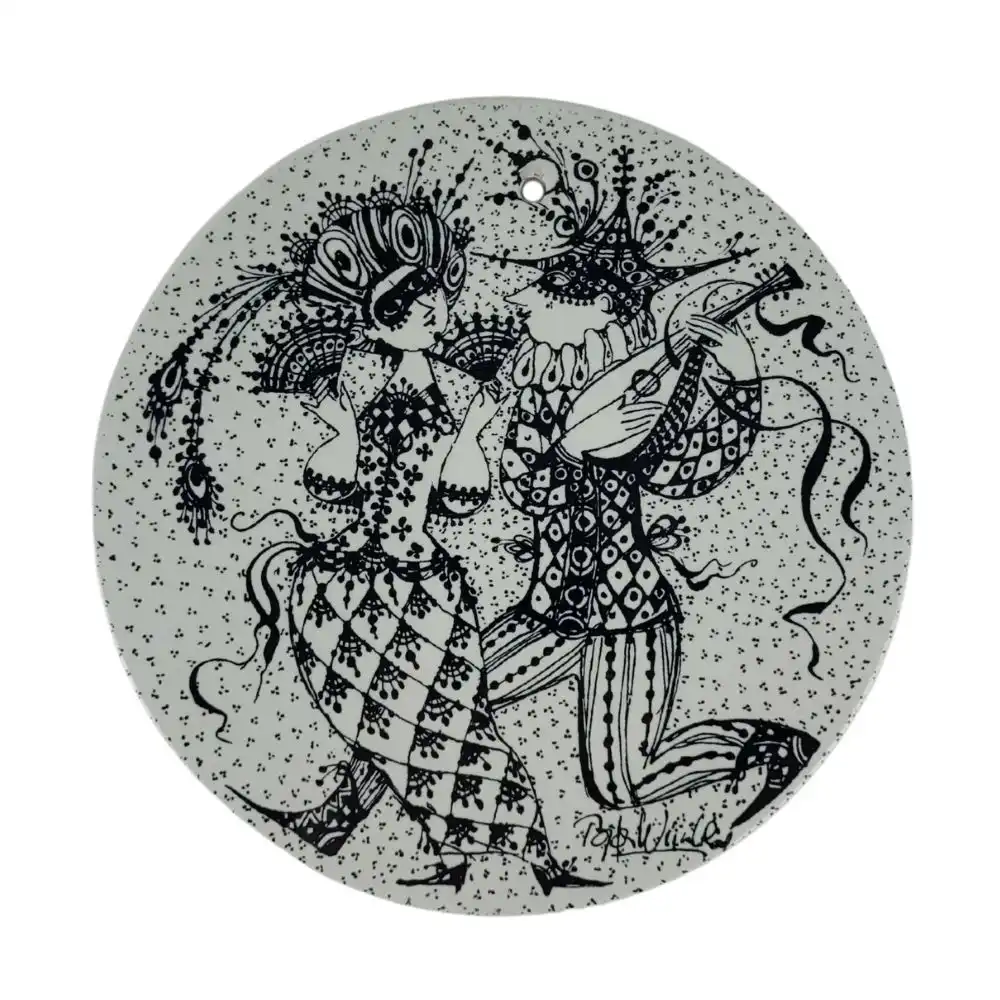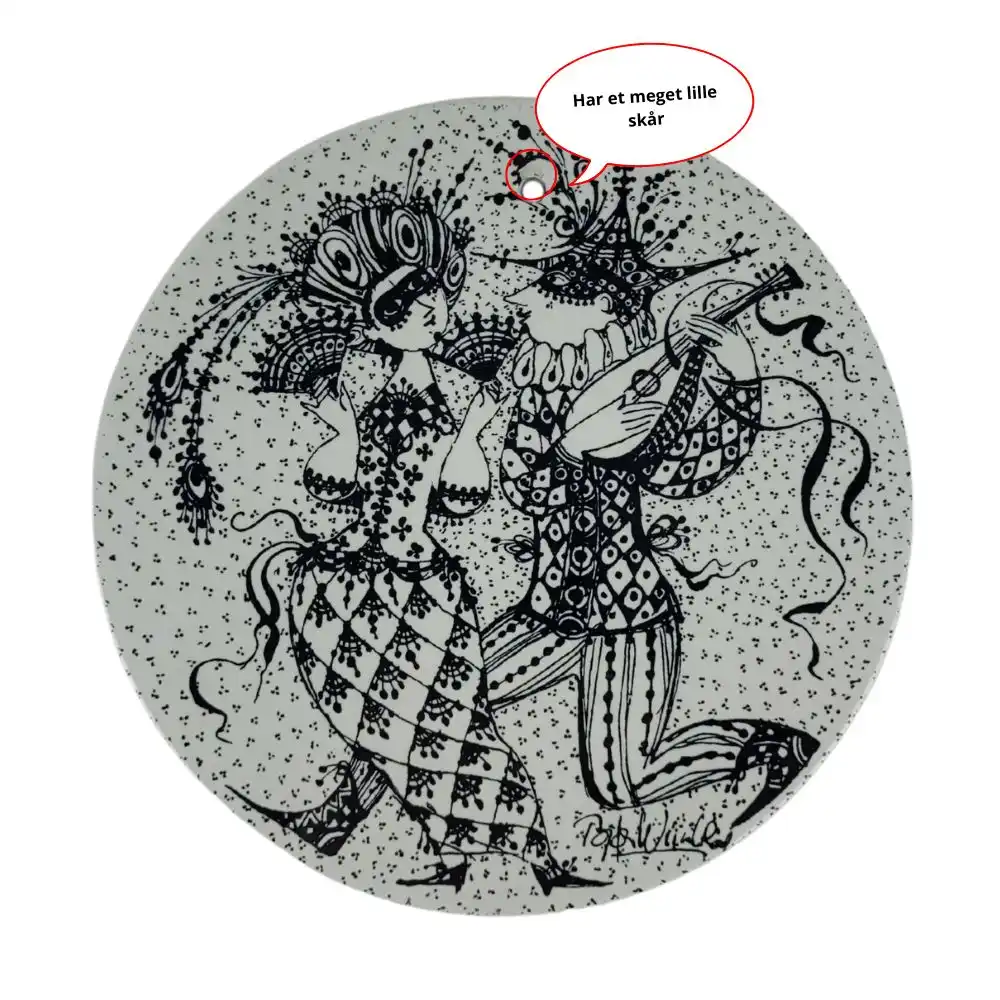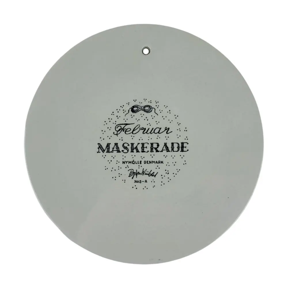 Bjørn Wiinblad platte februar, en elegant og karakteristisk vægdekoration i porcelæn med motiv af to maskerede figurer i typisk Bjørn Wiinblad-stil. Platten har et ophængshul i toppen, hvilket gør den perfekt som kunstnerisk element på væggen.