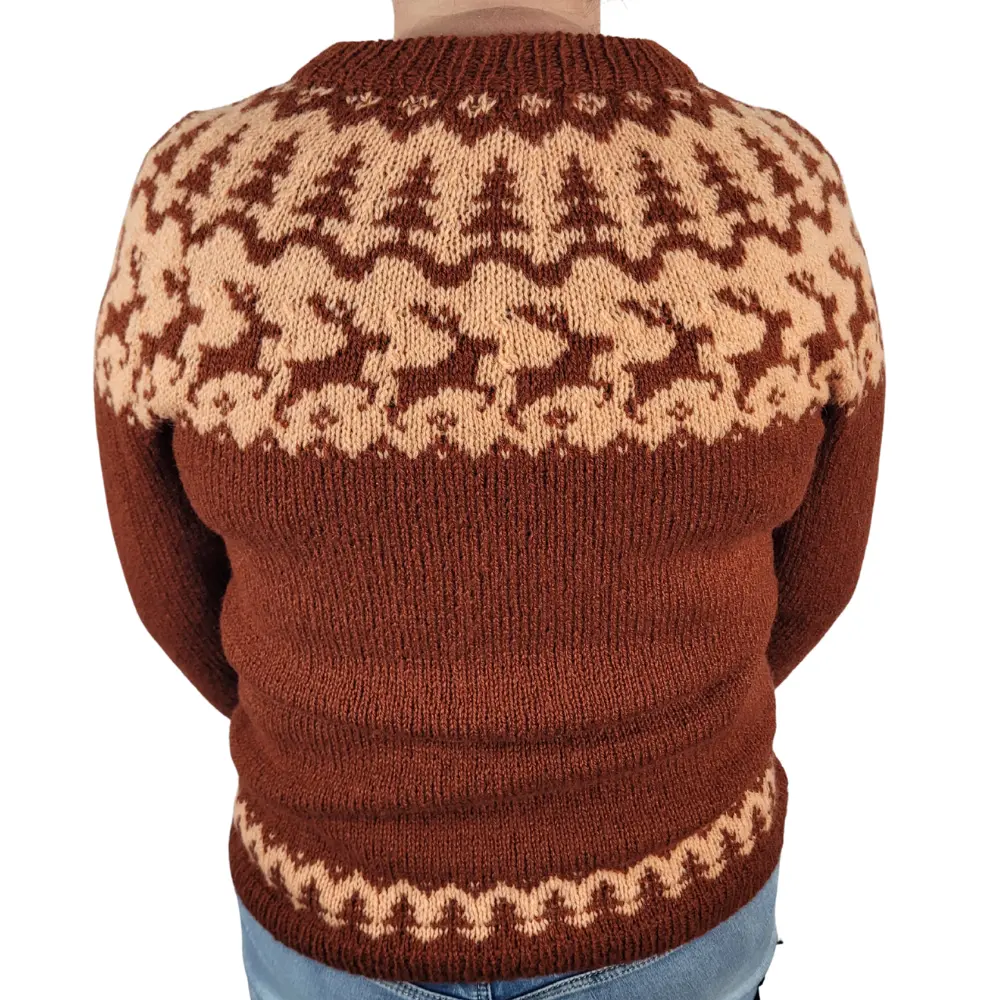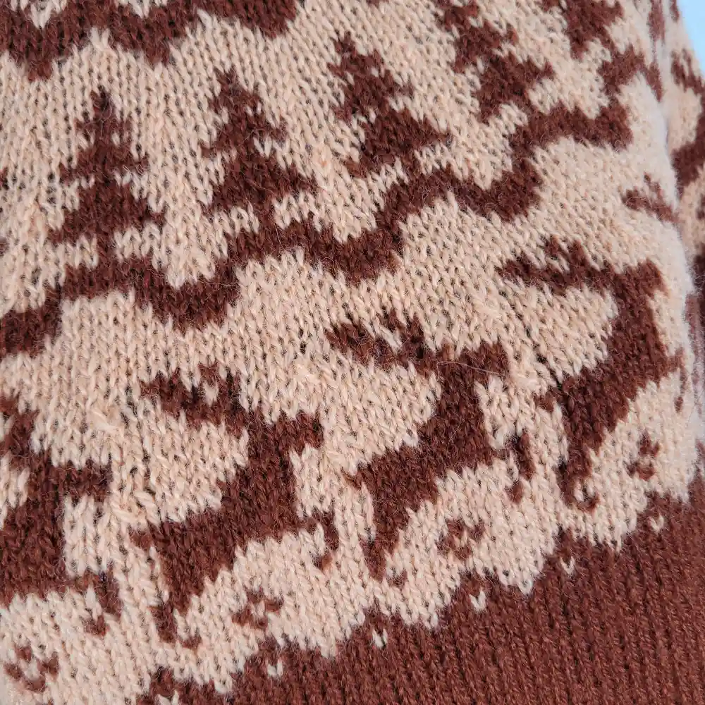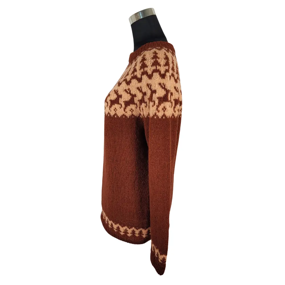 Lækker dejlig varm uld bluse, som har et flot mønster i nogle skønne brune og lakse farvet farver.