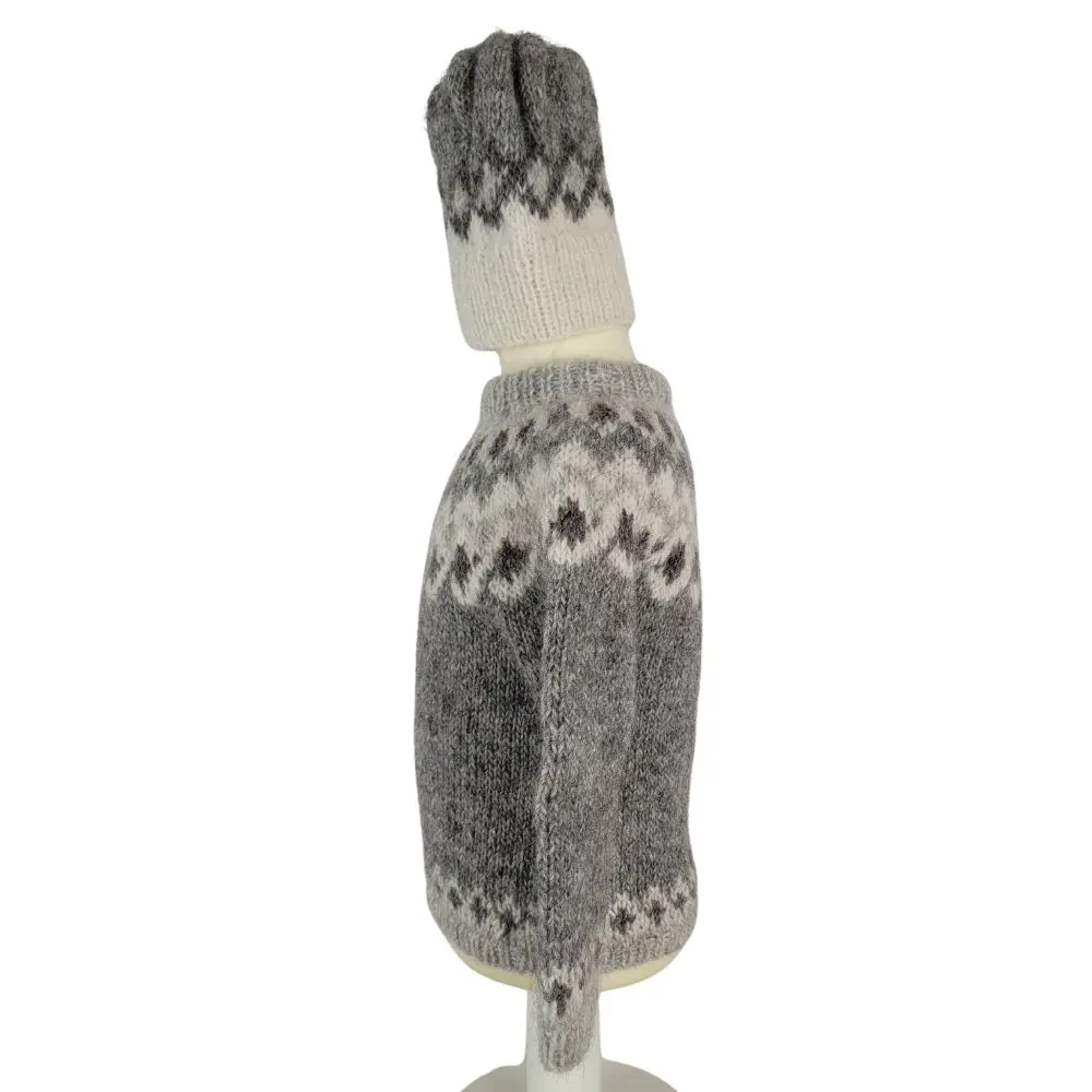Sættet er strikket i hvide og grå farver med et smukt mønster.
