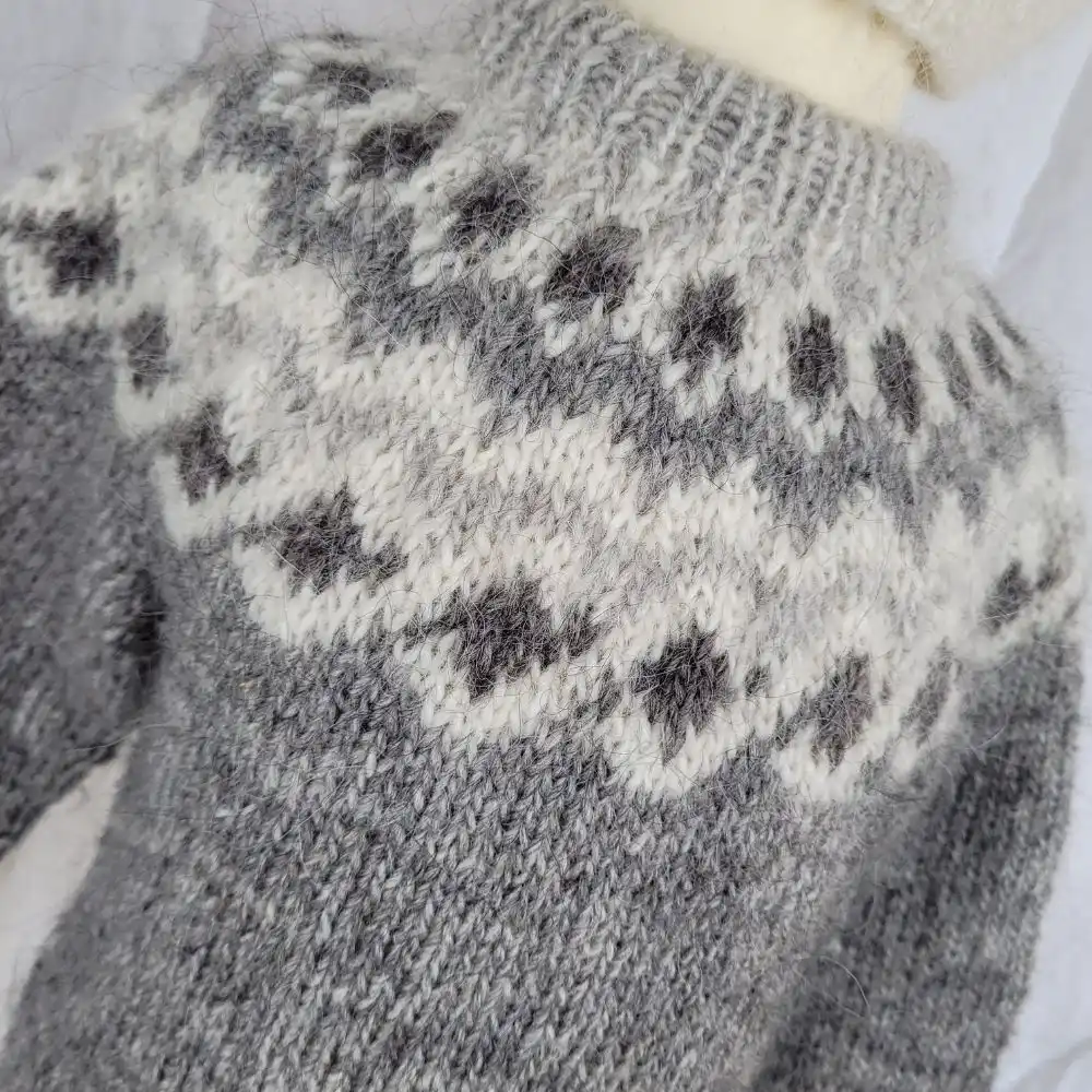Børnetrøje med hue som er håndstrikket i islandsk garn.
