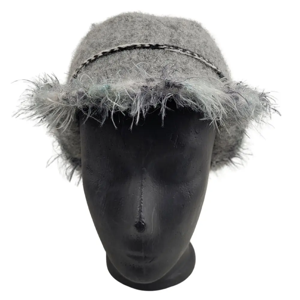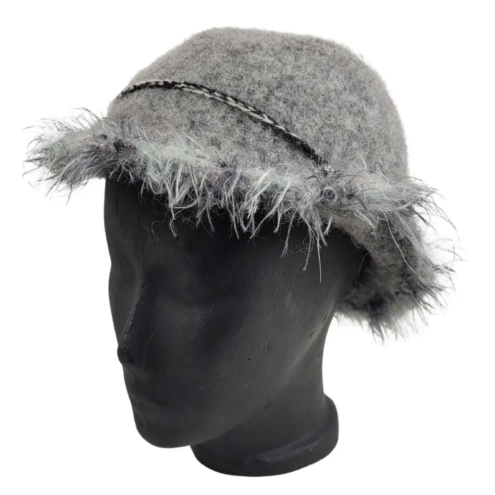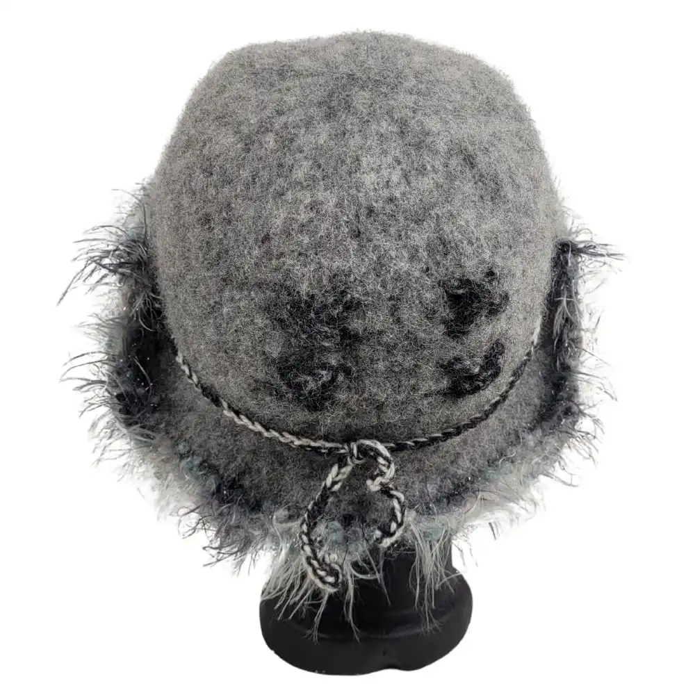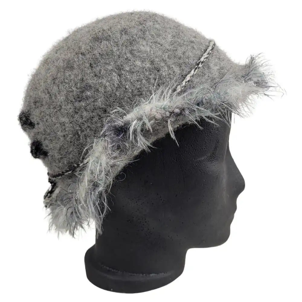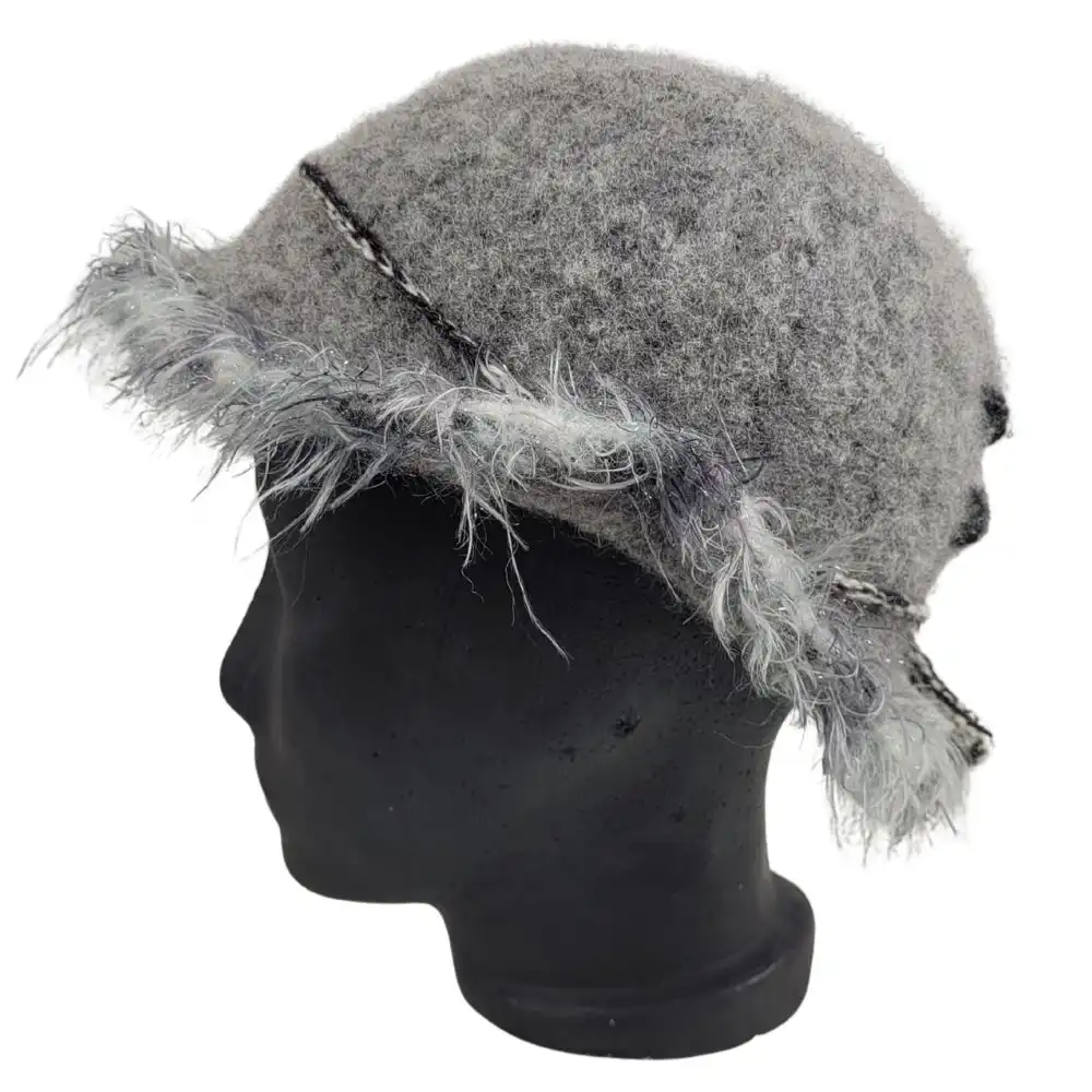 Grå hat med pelsgarn som er håndstrikket i en uld der ikke kradser og derefter filtet.