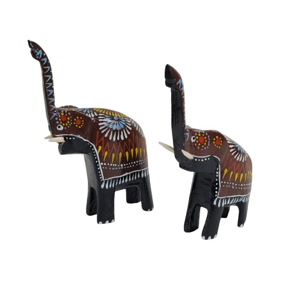 Smukke håndmalede træelefanter, der hver især er unikt dekoreret med farverige mønstre. Elefanterne er udskåret i træ og malet i varme nuancer af brun, gul, blå, rød og hvid, som giver et autentisk og eksotisk udtryk. Perfekte som pynt i hjemmet, til gave eller som en del af en samling af unikke håndværksfigurer.