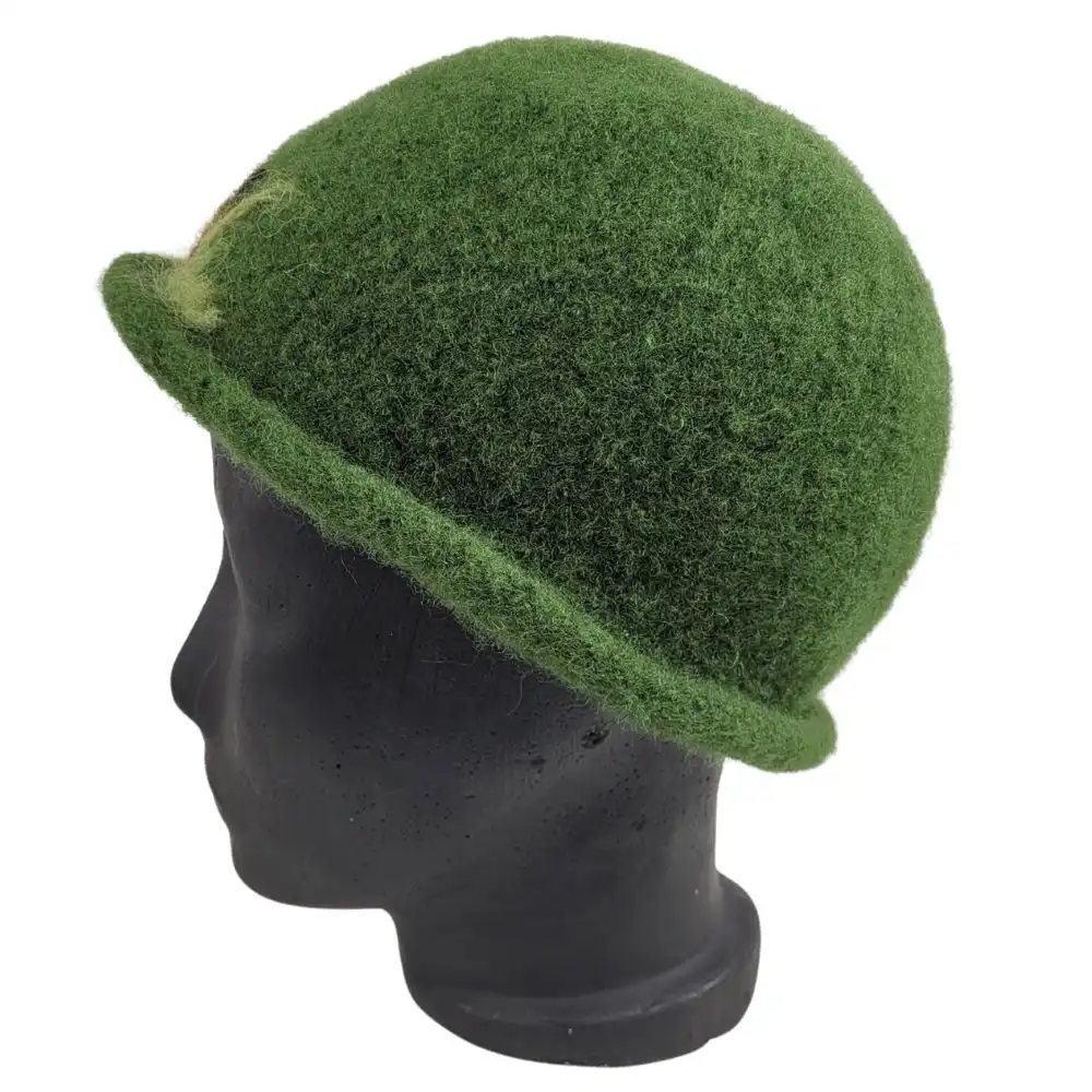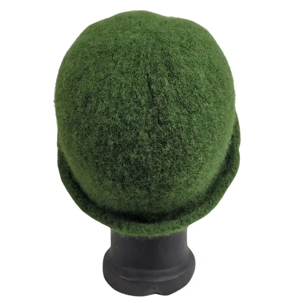 Hat i jægergrøn, som er håndstrikket i en uld der ikke kradser og derefter filtet.