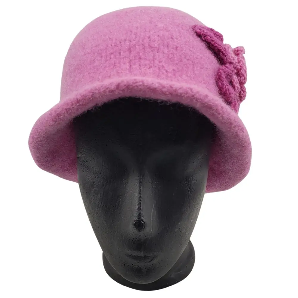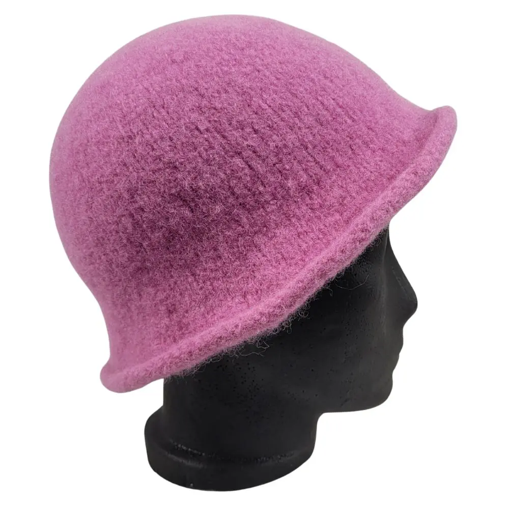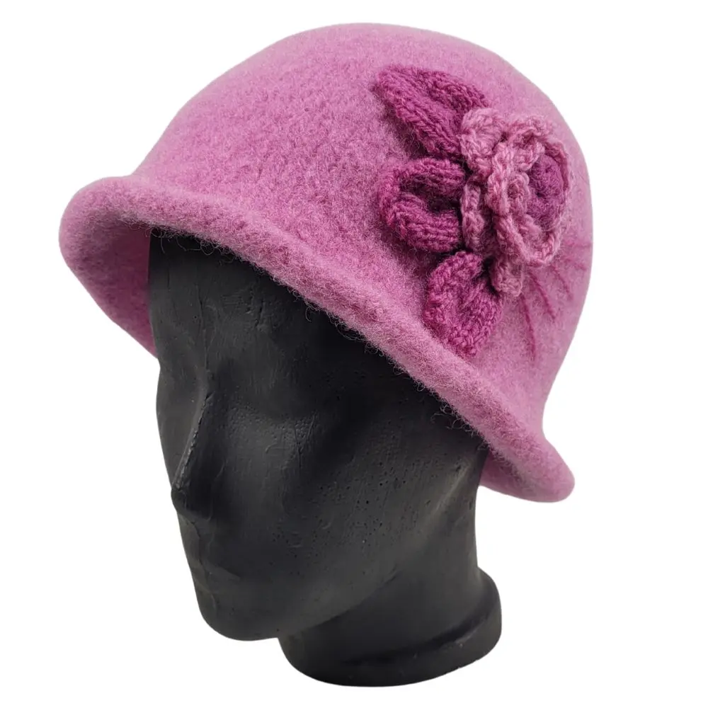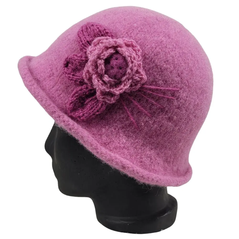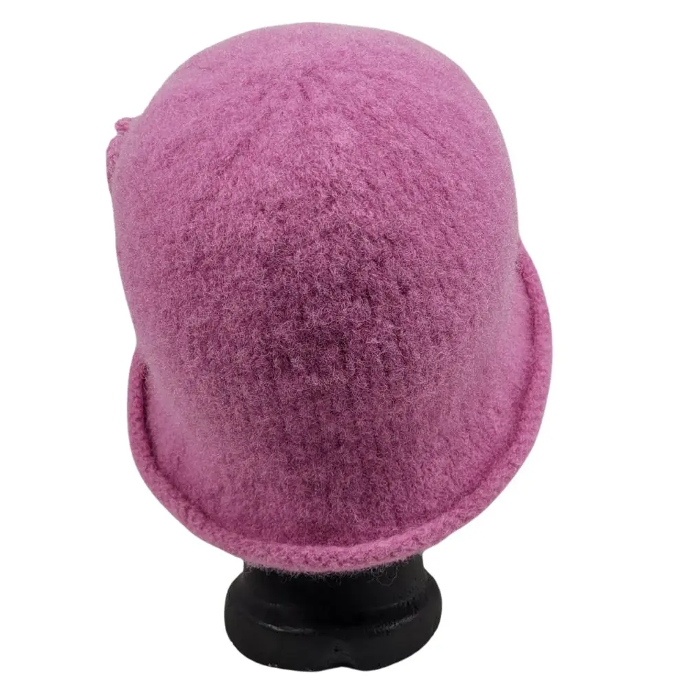 Hat i lys lyngfarve, som er håndstrikket i en uld der ikke kradser og derefter filtet.