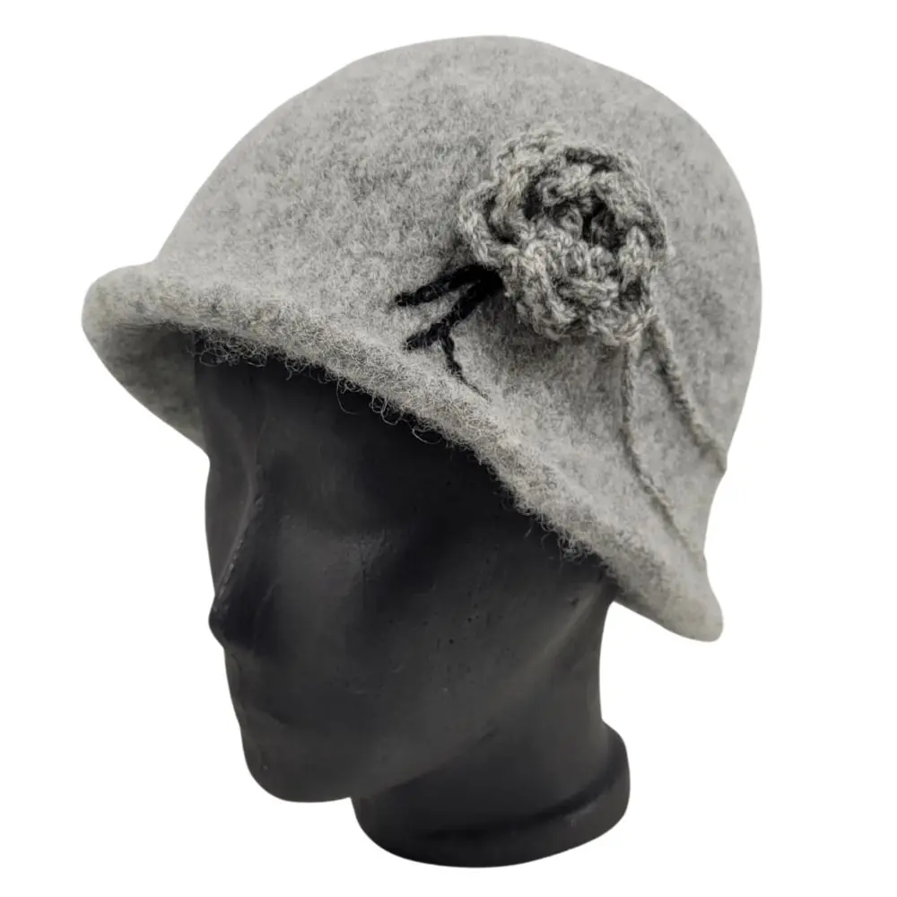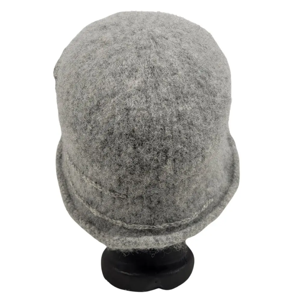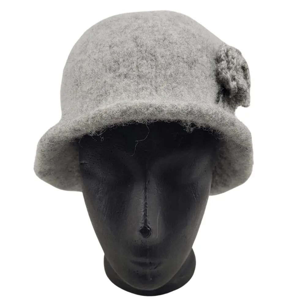 Hat i meleret grå, som er håndstrikket i en uld der ikke kradser og derefter filtet.
