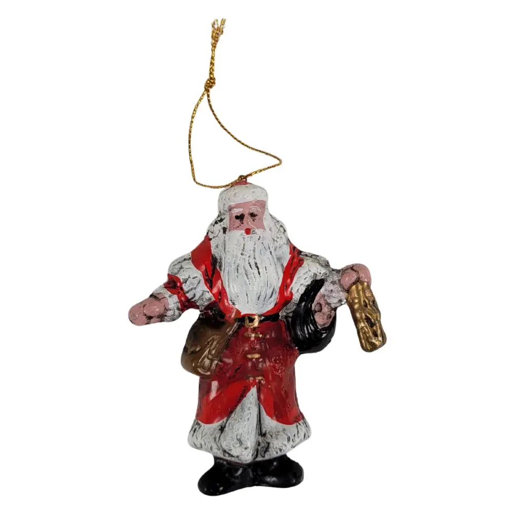 Skab ægte julestemning med denne charmerende julemand ophæng til juletræet. Figuren er malet i klassiske julefarver med rød frakke, hvidt skæg og små detaljer som guldpose og taske. Den hænger i en gylden snor, klar til at pynte på dit juletræ eller bruges som dekorativ ophængning i hjemmet.
