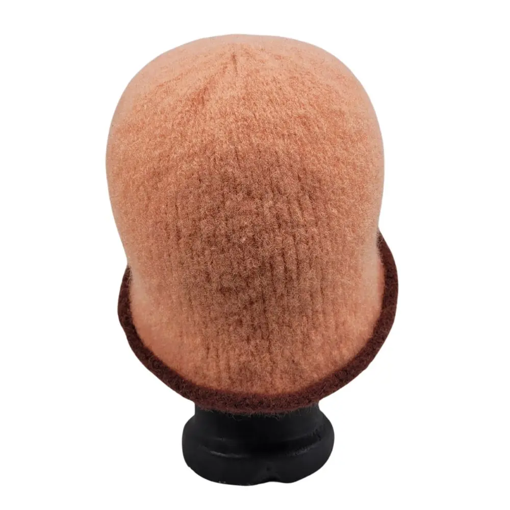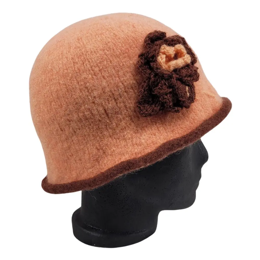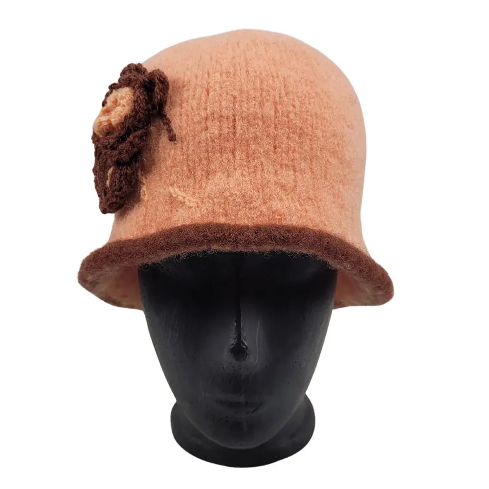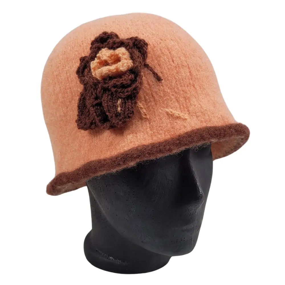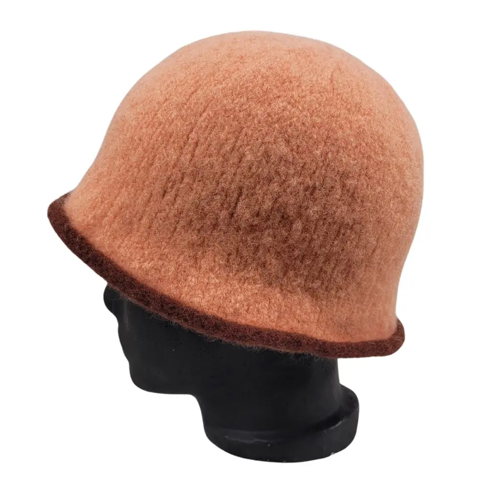 Rigtig dejlig Laksefarvet hat med brun , som er håndstrikket i en uld der ikke kradser og derefter filtet.