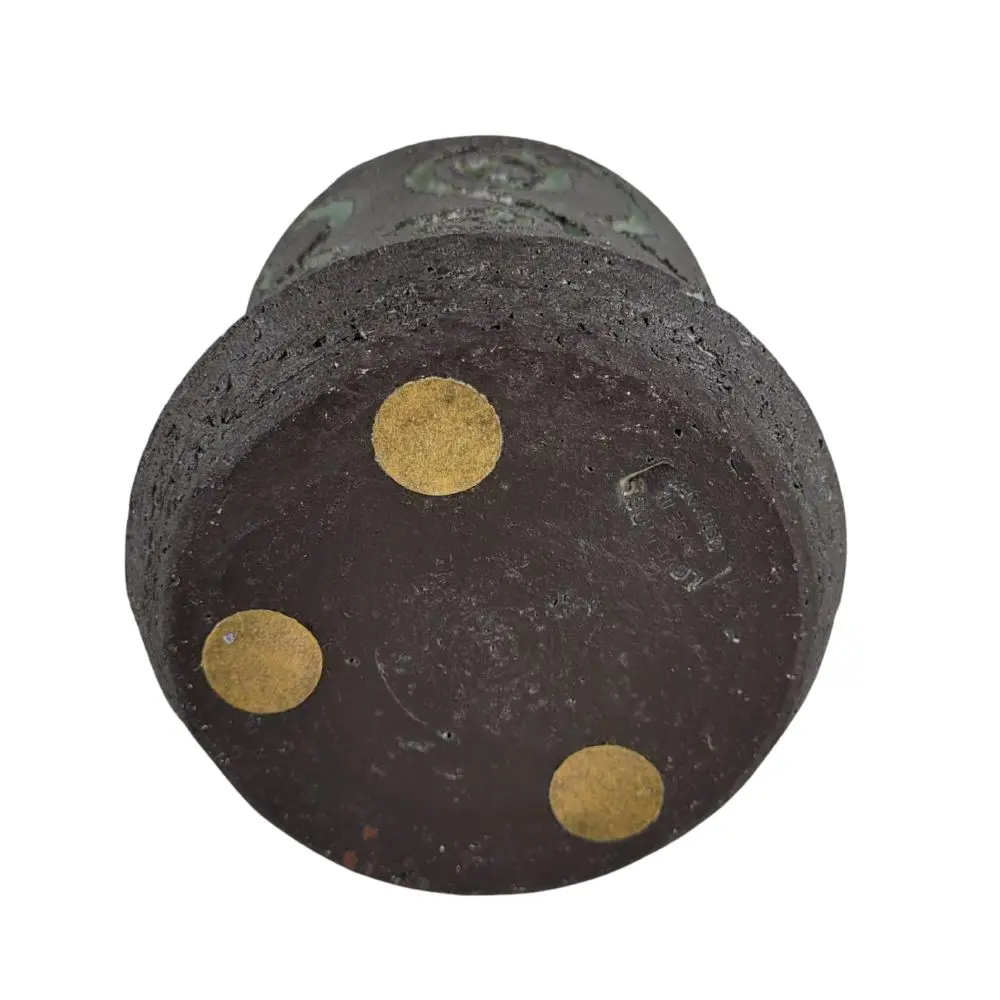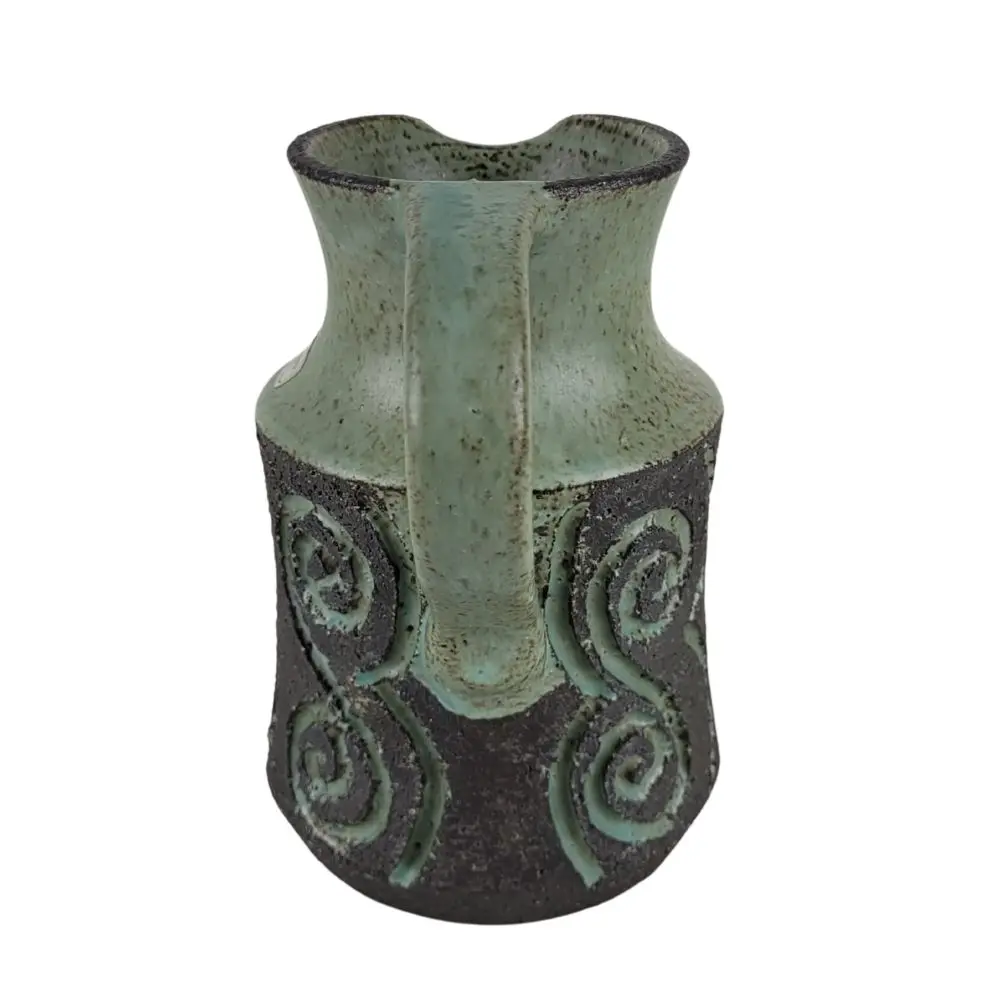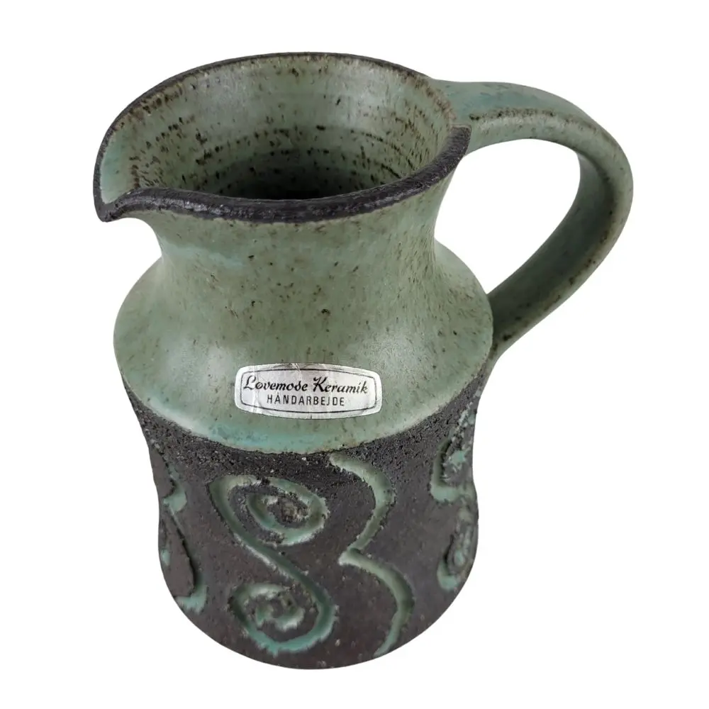 Smuk Løvemose kande en unik kande som er et klassisk eksempel på dansk stentøj med lava stil. Den grønne glasur øverst står i flot kontrast til den mørke, rå struktur med håndskårne swirl-mønstre. En dekorativ og eftertragtet genstand for både samlere og retroelskere.