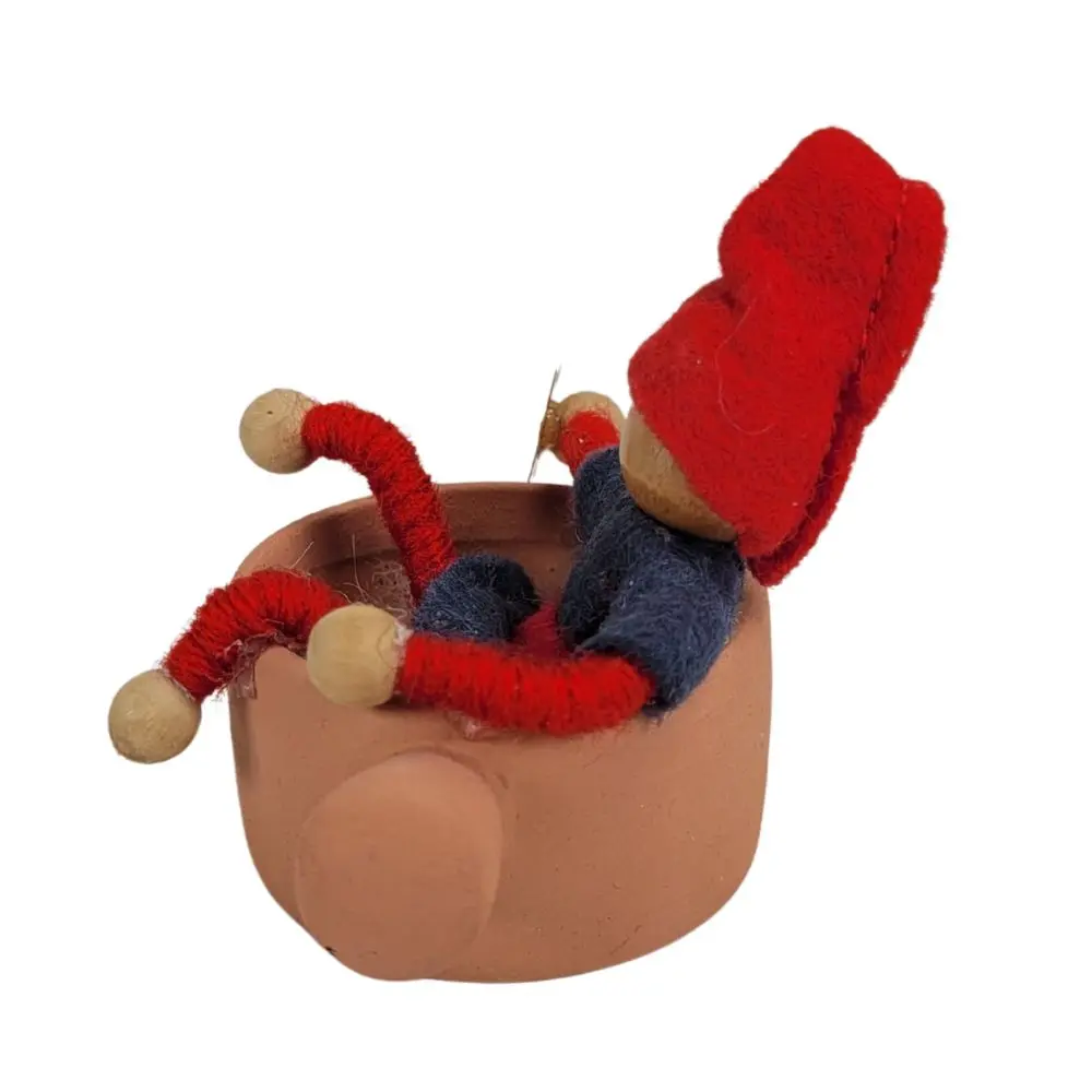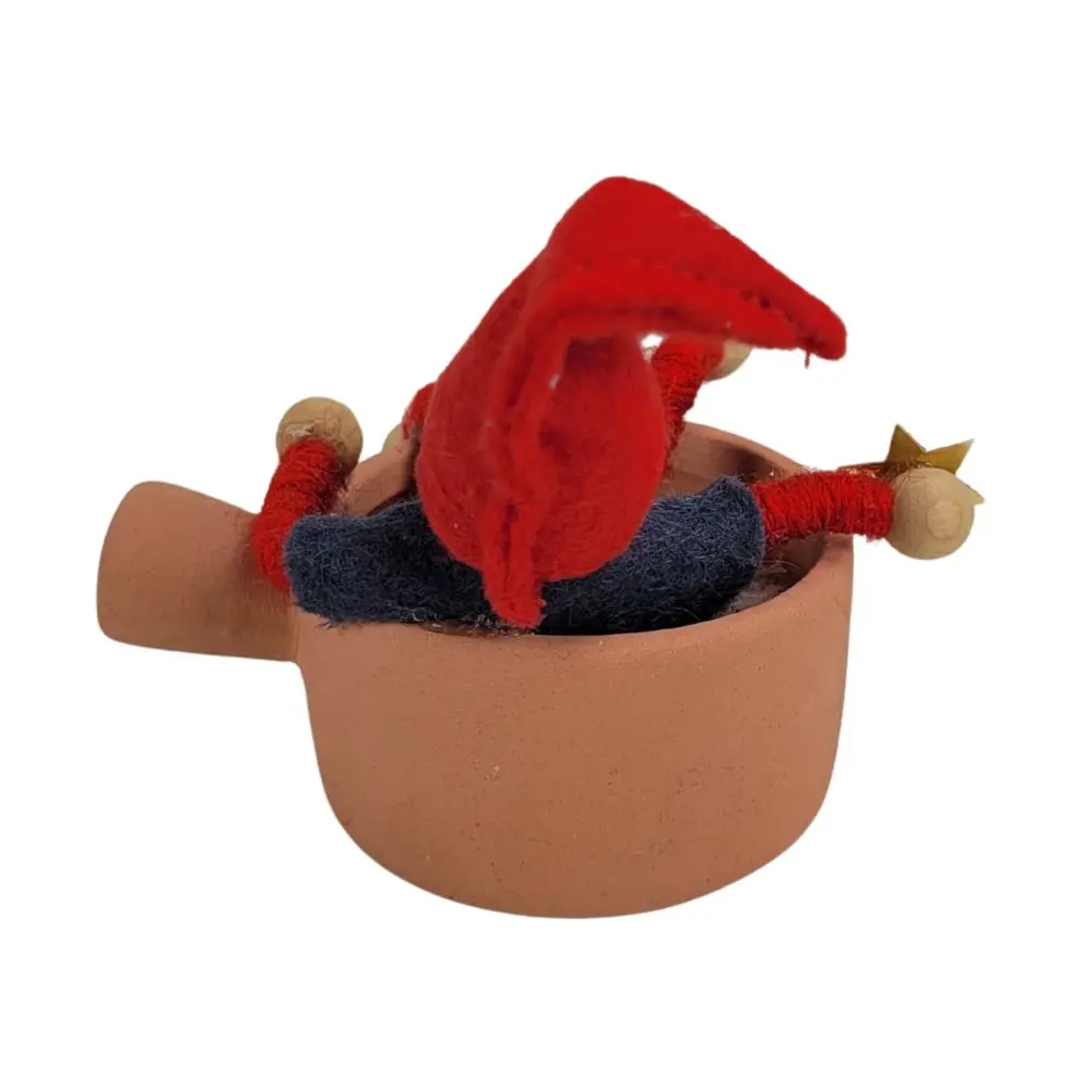 Sød nisse i gryde, en finurlig håndlavet nisse, der sidder hyggeligt i sin egen lille gryde. Med sin røde spidse hue, grå filttrøje og rød bælte, samt arme og ben af piberensere og træperler, bringer han varme og juleglæde til enhver krog af hjemmet. I hånden holder han en gylden stjerne, klar til at sprede lidt magi i decembermørket.