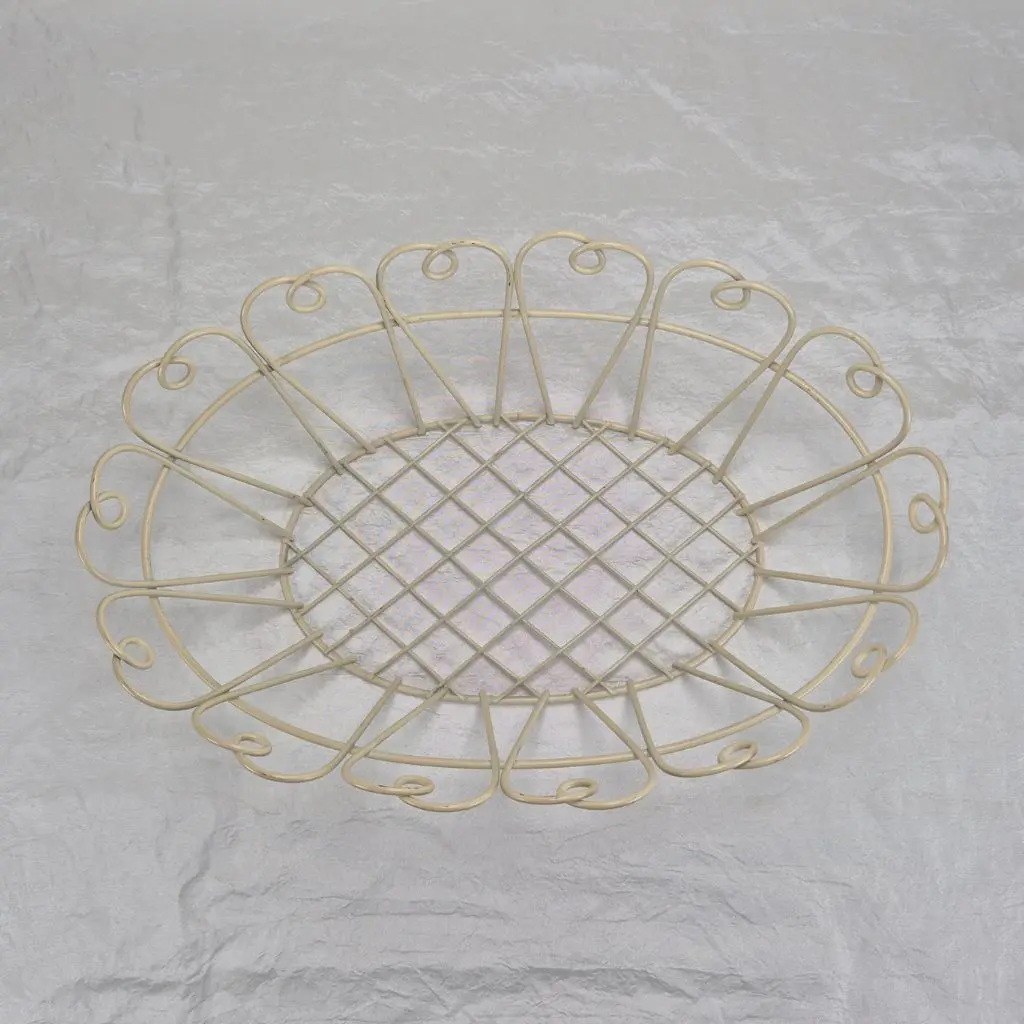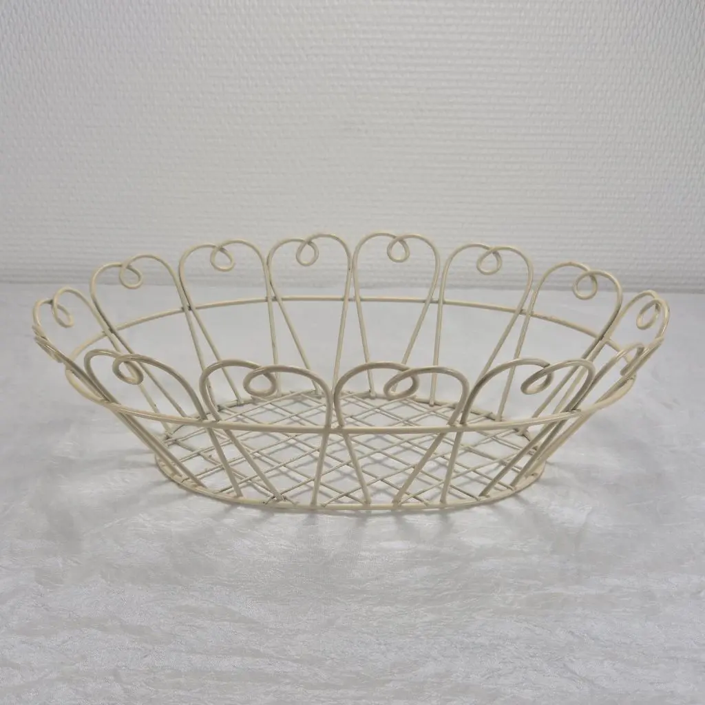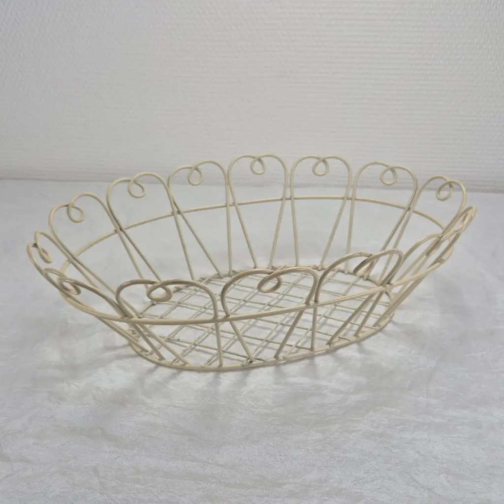 Oval dekorationskurv i metal, i lys cremefarve giver et let og romantisk udtryk i hjemmet. Den ovale form og de dekorative buer langs kanten gør kurven både praktisk og dekorativ. Perfekt til småopbevaring eller som en smuk del af borddækningen. Det luftige design passer godt ind i både landlig, vintage og moderne indretning.