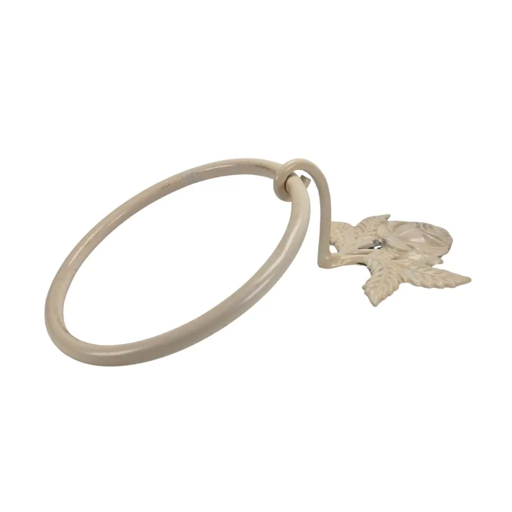 Rose håndklædeholder i metal, en smuk og romantisk vægholder med rosedetalje som giver et elegant udtryk i hjemmet. Den fine blomsterformede top og den runde ring gør den ideel som håndklædeholder på badeværelset, til viskestykker i køkkenet eller som dekorativ ophængsløsning i entréen. Det lyse metal og de bløde former passer perfekt ind i både vintage, landlig og klassisk indretning.