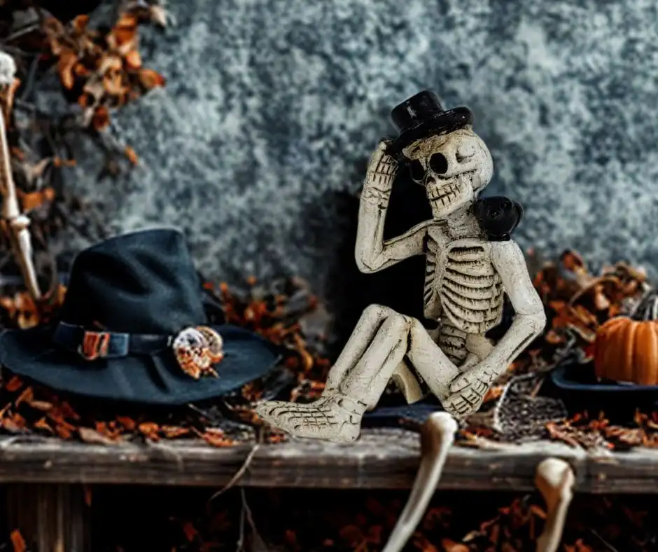Skelet med fugl, perfekt til det uhyggelig halloweenbord.