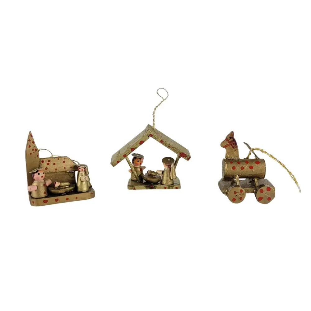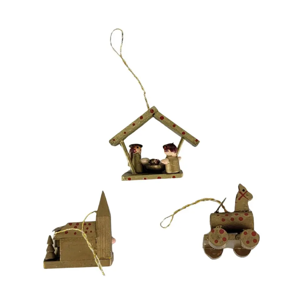 Charmerende sæt med 3 små træ juleophæng, perfekt til at bringe nostalgisk julestemning til dit hjem. Sættet består af to mini krybbespil med figurer samt en lille træk-pony, alle dekoreret med guld og røde detaljer. Ophængene har fine snore, så de er klar til at hænge direkte på juletræet eller bruges som hyggelig pynt i vinduet.