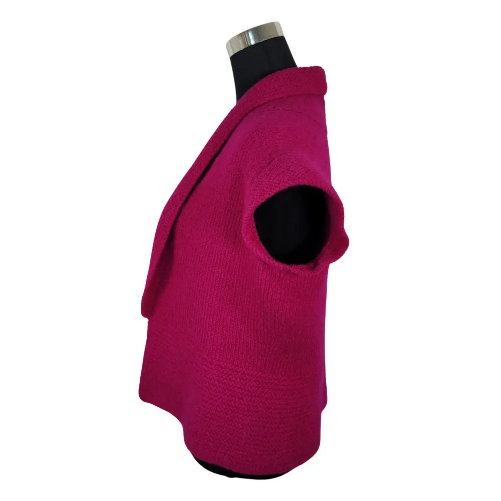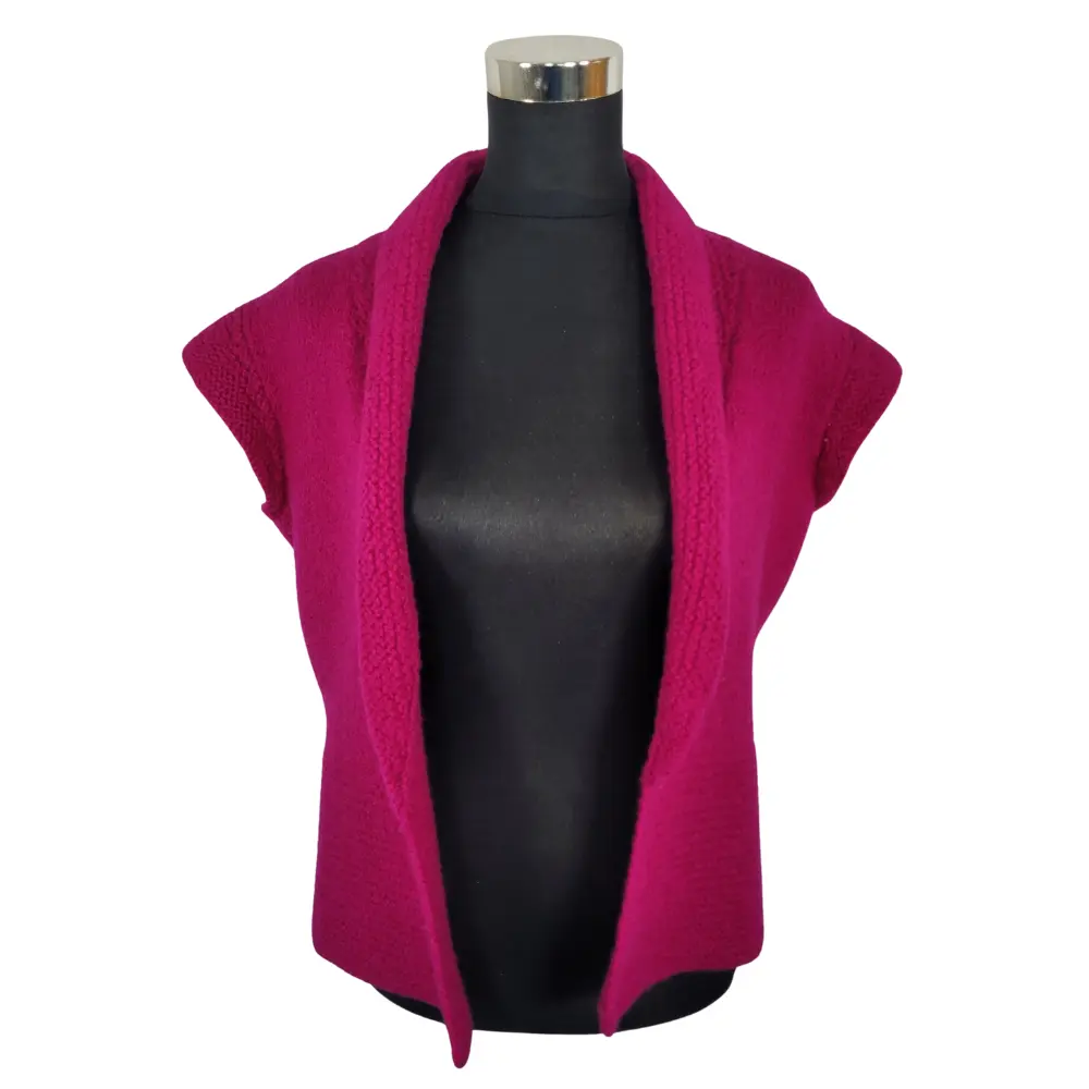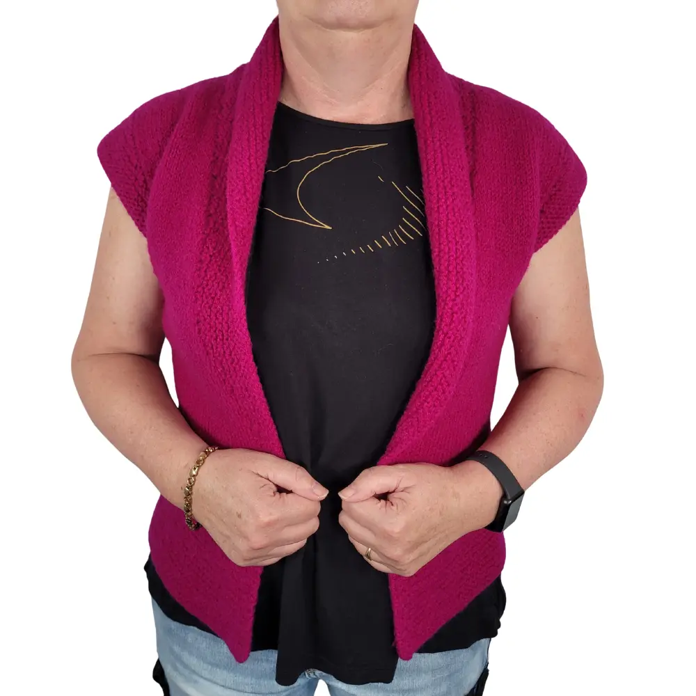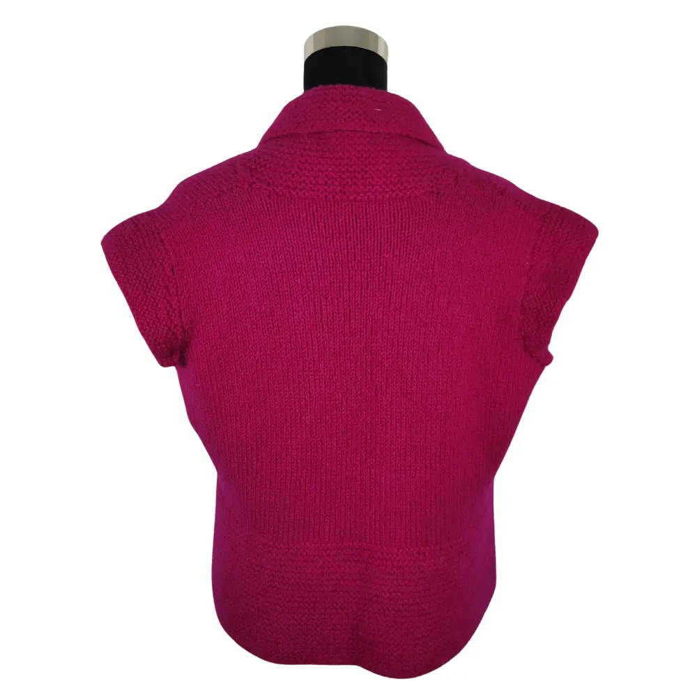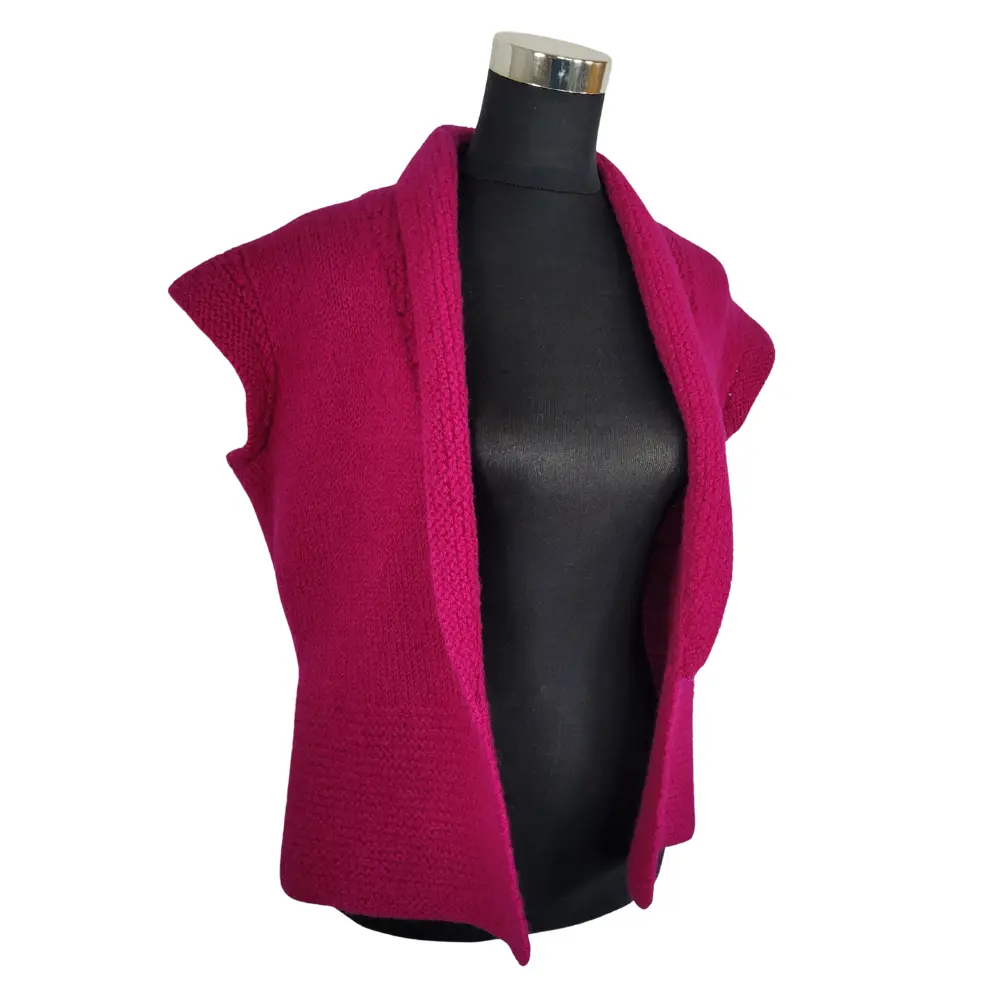 Super lækker varm håndstrikket uld vest, strikket i en skøn mørk pink farvet uld garn og bagefter filtet.